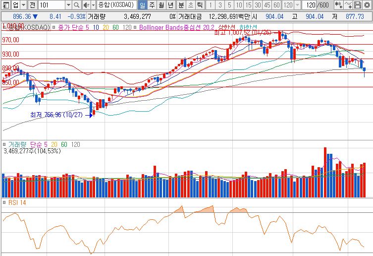 금일 코스닥 지수는 전 거래일 대비 8.41p 하락한 896.36(-0.93%) 마감 하였습니다. 코스닥은 120일선을 이탈한 상태인데 내일 반등이 나오면서 120일선을 지지하는 모습을 보여줘야 그나마 한시름 놓지 않을까 싶습니다. 기관의 수급이 없다는 것이 걸리는데 그나마 외인의 매수세가 나오면서 지수를 끌어 올린 모습 입니다.