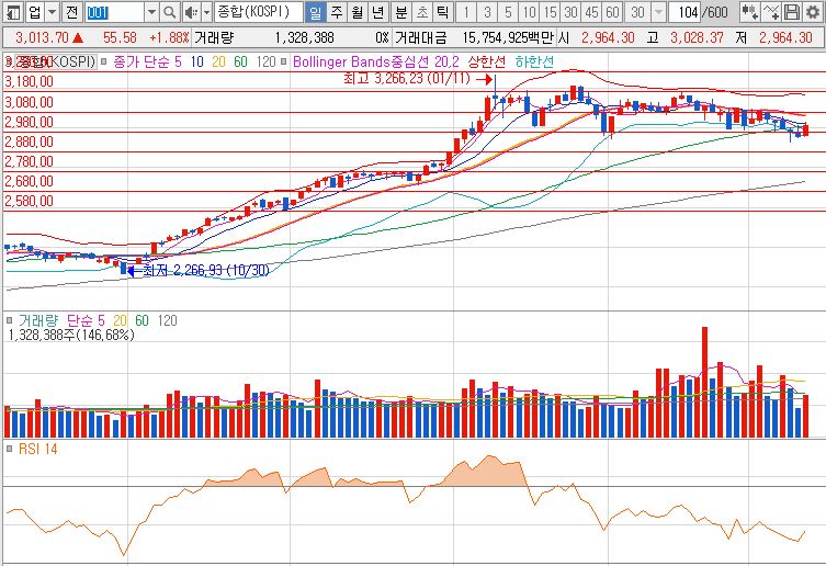 금일 코스피 지수는 전 거래일 대비 55.58p 상승한 3,013.70(1.88%) 마감 하였습니다. 간만에 양봉을 보는 듯 싶네요. 일봉 차트를 보면 60일선을 올라타면서 3,000지수를 다시 돌파한 상태인데요. 10일선까지 올라 타지 못한 것이 살짝 아쉽긴해도 오늘과 같은 수급이 이어진다면 추가 상승은 가능하지 않을까 싶습니다.