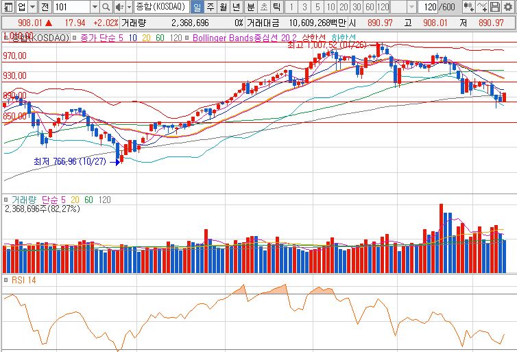 금일 코스닥 지수는 전 거래일 대비 17.94p 상승한 908.01(2.02%) 마감 하였습니다. 코스닥 역시 반등이 나오면서 일봉 120일선과 5일선까지 올라간 상태 입니다. 아직 10일선과 캔들간 이격이 있는 모습이지만 수급만 이어진다면 추가 상승이 가능할 것으로 보입니다. 20일선이 아직 하방인 점이 살짝 걸리긴 하는데 수급만 방향을 바꿀 것으로 보이네요.