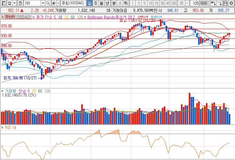 금일 코스닥 지수는 전 거래일 대비 2.28p 상승한 952.11(0.24%) 마감 하였습니다. 코스닥 역시 장초반 하락세를 보이면서 출발을 했지만 다행히도 반등이 나오면서 상승세로 마감을 했는데요. 아쉬운점은 60일선 돌파를 하지 못했다는 점이 되겠습니다. 장기 이평이다보니 쉽게 뚫기는 어려운 듯 싶습니다.