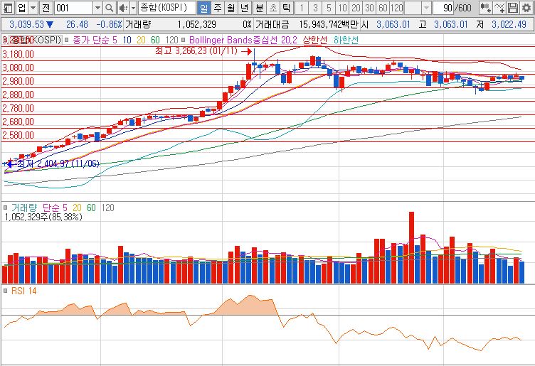 금일 코스피 지수는 전 거래일 대비 26.48p 하락한 3,039.53(-0.86%) 마감 하였습니다. 필라델피아 반도체 지수가 4%이상 급락하면서 국내 반도체 섹터에도 영향을 준 상태 입이며 관련 종목들의 약세장이 이어지면서 지수도 하락세를 보였습니다. 여기에 미국채금리 상승소식이 나오면서 외인과 기관의 자금이 이탈한 상태입니다. 개인이 매수를 했으나 역부족인 모습이네요.