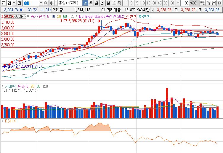 금일 코스피 지수는 전 거래일 대비 30.72p 하락한 3,004.74(-1.01%) 마감 하였습니다. 4p만 빠지면 코스피 3,000선이 무너지는 위치까지 내려 왔습니다. 기관과 외인의 매도세가 나오면서 지수 하락을 이끌었는데요. 앞서 말씀드린 것처럼 이번주까지는 변동성이 크게 나올 수 있으므로 가급적 관망하시거나 짧게보고 접근 하시는 것이 좋을 것 같습니다.