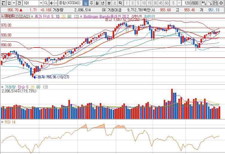 금일 코스닥 지수는 전 거래일 대비 1.71p 상승한 956.70(0.18%) 마감 하였습니다. 코스닥은 수급이 안좋았죠. 기관과 외인의 매도세가 나왔고, 개인이 매수를 했지만 지수를 끌어올리기는 살짝 버거운 모습이였습니다. 그래도 10일선 반등이 나오면서 60일선을 지지하는 모습이 나왔습니다.30분봉 흐름을 살펴보면 중심선인 20선까지 밀렸으나 반등이 나오면서 다시 상승하려는 모습이 나왔는데요. 수급만 들어온다면 코스닥도 상승세를 유지해 줄 것으로 보입니다.