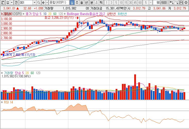 금일 코스피 지수는 전 거래일 대비 32.68p 상승한 3,041.01(1.09%) 마감 하였습니다. 기관과 외인의 수급이 들어오면서 상승세를 보였고 중심선인 20일선까지 올랕찬 상태로 마감 하였습니다. 다음주에도 수급이 들어온다면 3,050선 돌파 및 60일선 돌파 시도를 진행할 것으로 보입니다.30분봉 흐름을 살펴보면 어제 중심선인 20선을 지지하면서 반등이 나왔고, 60선과 120선까지 모두 돌파하면서 마감한 모습 입니다. 현재 흐름으로 본다면 다음 주에 일봉 60일선도 뚫지 않을까 하는 기대감이 살짝 생기네요.