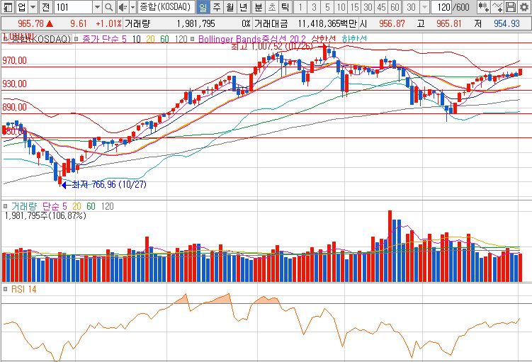 금일 코스닥 지수는 전 거래일 대비 9.61p 상승한 965.78(1.01%) 마감 하였습니다. 그간 60일선을 재대로 뚫지 못하면서 횡보하는 모습이 나왔는데 금일 깔끔하게 돌파하면서 마감한 모습 입니다. 기관과 외인의 수급이 들어오면서 돌파를 한 모습인데 코스닥도 추가적인 상승을 위해서는 수급이 이어져야 가능하니 체크 하시면서 대응 하셔야 겠습니다.