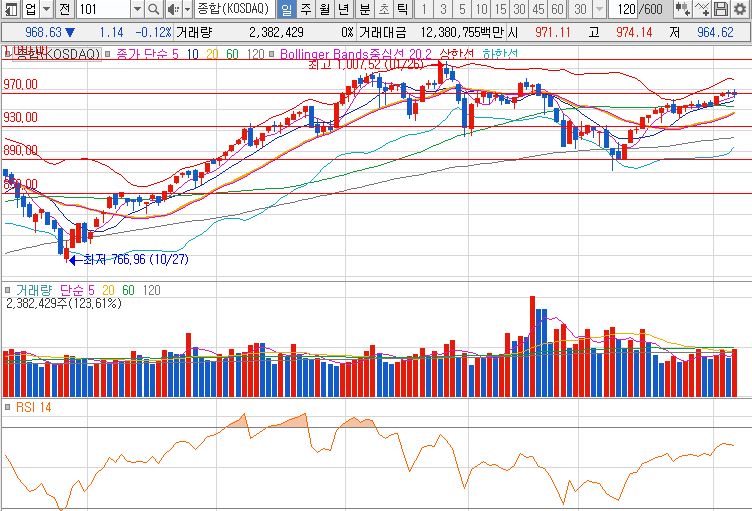 금일 코스닥 지수는 전 거래일 대비 1.14p 하락한 968.63(-0.12%) 마감 하였습니다. 코스닥은 어제에 이어 오늘도 약세를 보이고 있는데 바이오 섹터의 힘이 없다보니 지수도 약세를 보이는 상태죠. 여기에 정치 테마주들의 움직임이 지속적으로 나오면서 제약/바이오 섹터가 더 외면 받고 있는 것이 아닌가 싶습니다.