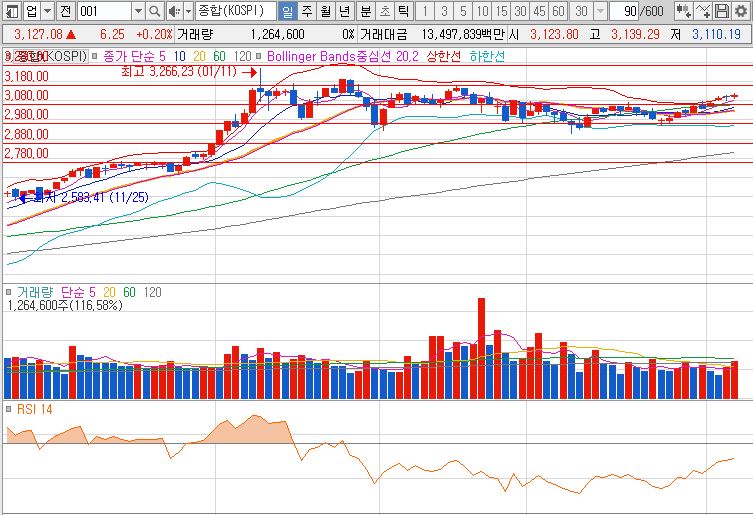 금일 코스피 지수는 전 거래일 대비 6.25p 상승한 3,127.08(0.20%) 마감 하였습니다. 일봉 5일선을 지지하면서 움직이는 모습이고 외인의 수급이 들어 오면서 상승세를 유지하고 있으며 5일선 이탈 여부를 체크 하시면서 대응하시면 될 것 같습니다. 30분봉 흐름을 살펴보면 장초반 상승과 하락을 반복 했으나 20일선을 지지하면서 반등이 나왔고 우상향 하는 흐름을 보이고 있습니다.(수급 체크는 꼭 하셔야 될 것으로 보이네요.)