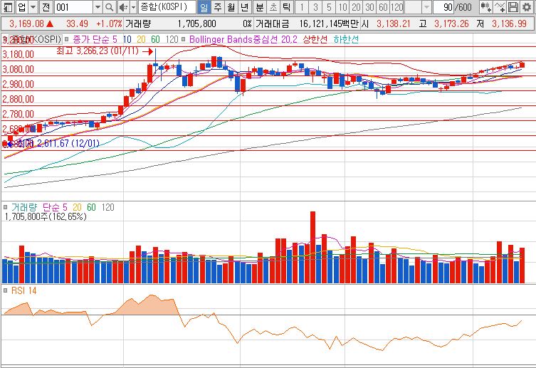 내일도 상승세를 유지한다면 볼밴 상단을 뚫는지, 5일선을 지지해주는지 체크 하셔야 겠으며 3,180선을 넘어 서는지도 보셔야 겠습니다.