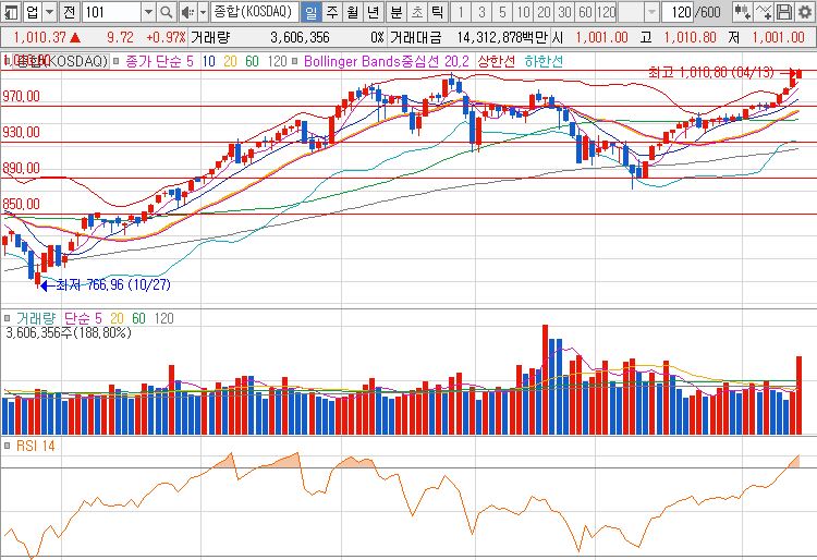 금일 코스닥 지수는 전 거래일 대비 9.72p 상승한 1,010.37(0.97%) 마감 하였습니다. 볼밴상단 위에서 상승세를 유지하고 있는 모습이며, 전 고점을 돌파하면서 천스다을 유지하고 있습니다. 기관과 외인의 매도세가 나온 상태이지만 개인의 매수세가 지수를 끌어 올렸으며 백신 이슈가 나오면서 제약/바이오 섹터도 강세를 보였습니다.