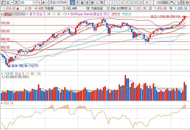 금일 코스닥 지수는 전 거래일 대비 4.05p 상승한 1,014.42(0.40%) 마감 하였습니다. 코스닥 역시 상승세를 유지한 모습이죠. 하지만 볼밴 상단에 캔들이 위치한 상태이다보니 큰 폭으로 상승하진 않았지만 볼밴 상단을 지지하면서 움직이는 상태 입니다. 30분봉 흐름을 보면 종가 기준으로 5, 10선을 살짝 이탈한 상태에서 마감을 했는데 내일 20선 지지 및 반등이 나오는지 체크 후 접근 하시는 것이 좋겠습니다. 수급은 코스피와 비슷한 수급이 들어온 모습 입니다.
