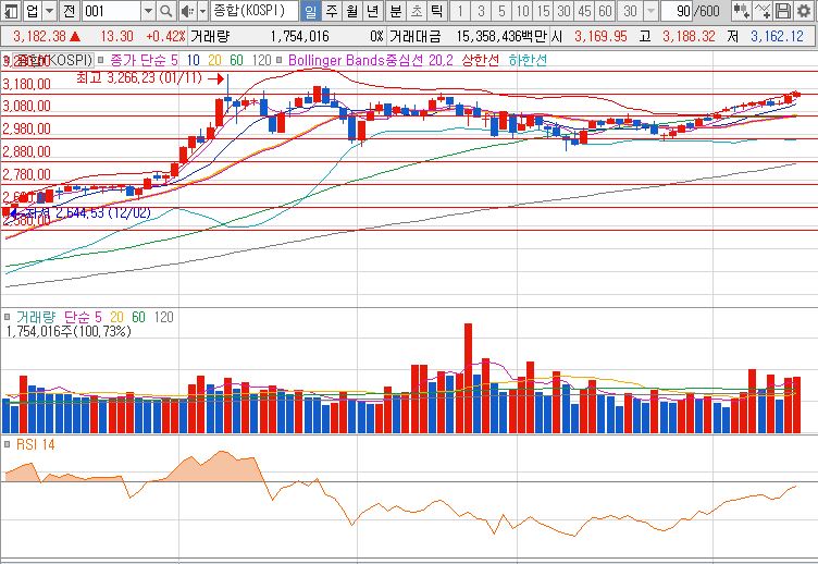 금일 코스피 지수는 전 거래일 대비 13.30p 상승한 3,182.38(0.42%) 마감 하였습니다. 어제의 흐름일 이어가면서 5일선 이탈 없이 상승세를 이어가는 모습이고 3,180선을 돌파하면서 마감한 상태 입니다. 30분봉 흐름상 5선을 이탈한 모습인데 내일 시초가가 어디에 형성되는지 확인하시고 접근하시는 것이 좋겠습니다. 매매동향을 보면 개인의 매도세가 나오기는 했으나 기관과 외인의 매수세가 강하게 들어오면서 지수 상승세를 유지한 모습 입니다.