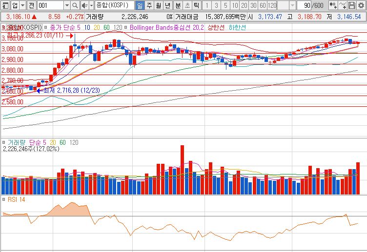 금일 코스피 지수는 전 거래일 대비 8.85p 상승한 3,168.10(0.27%) 마감 하였습니다. 반도체 섹터의 약세로 장중 한 때 20일선까지 밀렸으나 개인의 매수세외 외인의 매도세가 줄어들면서 3,180선을 재 돌파하는 모습이 나왔습니다. 현재 흐름만 본다면 횡보하는 듯한 모습이 나오고 있는데요. 30분봉 흐름을 보면 다행히도 저점을 높여가면서 상승 중인 부분을 확인 할 수 있습니다. 캔들 머리위에 있는 60선과 120선 돌파를 보시고 접근 하시는 것이 좋겠습니다.