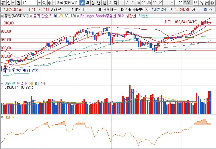 금일 코스닥 지수는 전 거래일 대비 1.11p 상승한 1,026.82(0.11%) 마감 하였습니다. 코스닥도 장초반 10일선까지 밀렸으나 외인과 기관의 매수세에 반등이 나왔으며 5일선을 올라타면서 마감한 모습입니다. 30분봉 흐름을 보면 코스닥 역시 저점을 높여가면서 횡보를 하는 상태 인데요. 1,030선 돌파를 하는지 체크 하시면서 대응 하시는 것이 좋겠습니다.