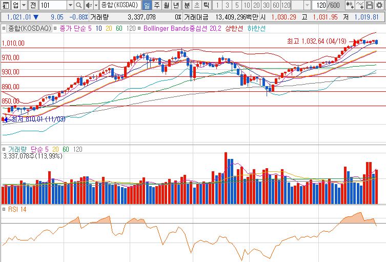 금일 코스닥 지수는 전 거래일 대비 9.05p 하락한 1,021.01(-0.88%) 마감 하였습니다. 코스닥은 10일선을 이탈하면서 올라오는 20일선을 마중 나갈 그림을 그리는 상태 인데요. 캔들이 마중 나가기 보다는 횡보하면서 20일선이 올라 오는 것이 안정적일텐데요. 1,010선(1,000선)을 지키는 보시면서 대응 하시는 것이 좋겠습니다. 수급은 코스피와 동일하게 외인과 기관의 차익 매물이 많이 나온 모습 입니다.