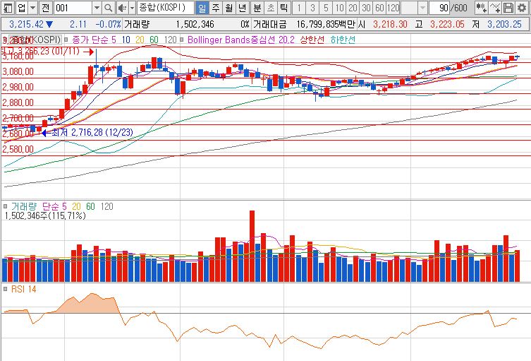 금일 코스피 지수는 전 거래일 대비 2.11p 하락한 3,215.42(-0.07%) 마감 하였습니다. 5, 10일선을 지지하면서 횡보하는 모습이 나오고 있는데요. 단순하게 차트만 봤을 때 60일선의 방향이 상승쪽으로 전환대야 전고점 돌파가 가능하지 않을까 싶습니다. 여기에 수급도 받쳐줘야 가능할텐데요. 금일은 외인과 기관의 차익 매물이 많이 나오면서 조정을 받는 모습으로 마감 하였습니다.