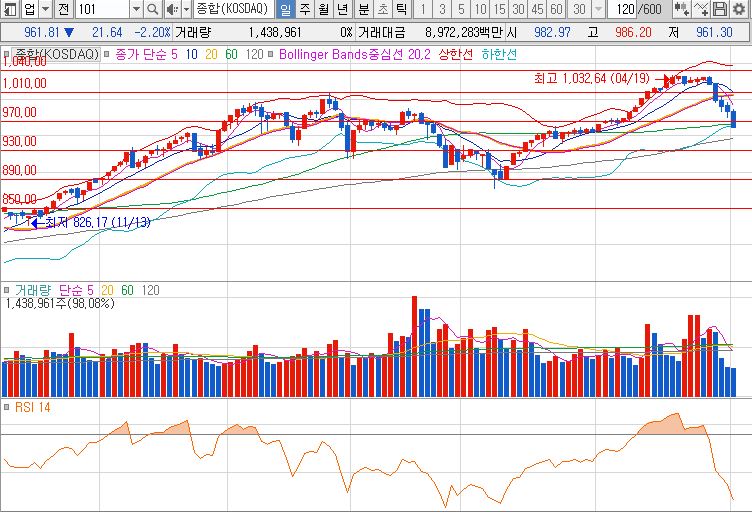 금일 코스닥 지수는 전 거래일 대비 21.64p 하락한 961.81(-2.20%) 마감 하였습니다. 코스닥은 970과 60일선을 이탈하면서 위태로운 모습을 보이고 있는데요. 내일 상승 반전을 하지 못한다면 올라오는 120일선까지 열고 대응해야 할 것으로 보입니다. 공매도가 지수 하락에 가장 큰 영향을 준 상태죠. 셀트리온 계열사들의 하락세가 지수에 영향을 준 상태 입니다. 매매 동향은 코스피와 동일하며 현재 구간에서는 매수 보다는 관망하시는 것이 좋겠습니다.