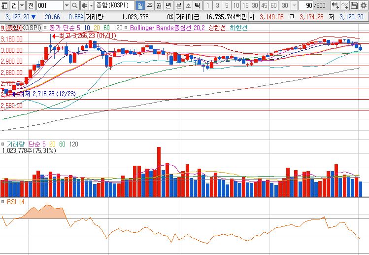 금일 코스피 지수는 전 거래일 대비 20.66p 하락한 3,127.20(-0.66%) 마감 하였습니다. 공매도 영향을 그나마 덜 받은 듯한 모습이죠. 삼성전자와 SK하이닉스 등 지수에 영향을 주는 종목들 중 일부가 상승하면서 지수 하락을 막은 모습이긴한데 내일까지 이어지리란 보장은 없으니 조심 하셔야 겠습니다. 일봉 60일선이 캔들 아래 있는데 반등이 나오는지 체크 후 접근 하시는 것이 좋겠습니다.