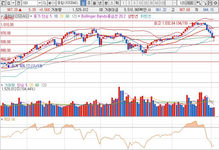 금일 코스닥 지수는 전 거래일 대비 5.39p 상승한 967.20(0.56%) 마감 하였습니다. 코스닥은 코스피에 비해 많이 흘러 내렸는데요. 120일선까지 밀리면서 자칫 위험한 상황이 나올뻔 했으나 다행히도 기관과 외인의 매수세가 들어오면서 60일선 위에 안착한 상태로 마감 하였습니다. 아직 완벽하게 하락 추세가 끝났다고 할 수는 없겠지만 다음 거래일에 5일선을 올라타는지 체크 하셔야 겠습니다.
