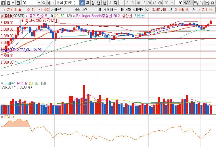 금일 코스피 지수는 전 거래일 대비 52.10p 상승한 3249.30(1.63%) 마감 하였습니다. 지난주 20일선 돌파 후 상승세를 유지하고 있는 모습이며 볼밴 상단을 뚫고 지지하는 모습으로 마감하였습니다. 수급이 가장 좋았던 하루가 아니였나 싶은데요. 기관과 외인의 매수가 강하게 들어오면서 지수 상승을 견인한 모습 입니다.