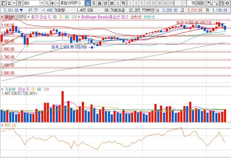 금일 코스피 지수는 전 거래일 대비 47.77p 하락한 3,161.66(-1.49%) 마감 하였습니다. 어제 20일선을 지지하는 모습을 보여주면서 반등을 기대하게 만들었는데 역시나 수급이 꼬이면서 지수도 하락한 모습이 나왔습니다. 인플레 우려가 커지면서 외인들의 차익 매물이 많이 나온 상태이고, 기관도 일부 매도 물량을 내놓은 모습입니다. 개인이 물량을 받아 가긴 했으나 다시 끌어올리기에는 역부족이 아니였나 싶습니다.