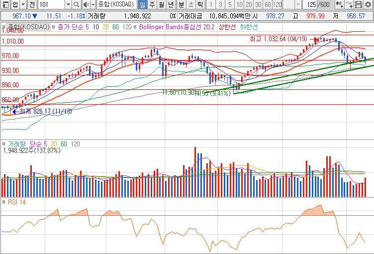 금일 코스닥 지수는 전 거래일 대비 11.51p 하락한 967.10(-1.18%) 마감 하였습니다. 5일선을 지지하지 못하면서 60일선까지 밀린 모습이며, 현재 부근을 지지하지 못한다면 120일선까지 밀릴 수 있는 우울한 상황이 펼쳐질 수 있겠습니다. 수급은 코스피와 동일하게 기관과 외인의 차익 매물이 나온 모습이며 수급 개선 후 접근하는 것이 좋을 것 같습니다.