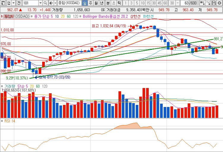 금일 코스닥 지수는 전 거래일 대비 13.70p 상승한 962.07(1.44%) 마감 하였습니다. 어제의 하락폭 일부를 만회한 모습이긴 하지만 5일선을 올라타지 못한 부분이 살짝 걸리는데요.(그나마 장기 이평선인 120선은 올라탄 모습입니다.) 코스닥 역시 외인과 기관의 대량 매수세가 들어오면서 지수를 끌어 올린 모습인데 내일도 수급이 이어져야 상승세를 이어 갈 수 있으니 참고 하시면 되겠습니다.