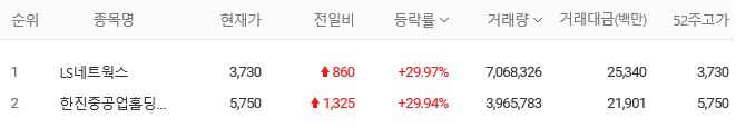 그럼 금일 상한가 종목을 살펴 보도록 하겠습니다.