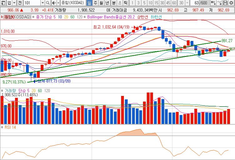 금일 코스닥 지수는 전 거래일 대비 3.99p 상승한 966.06(0.41%) 마감 하였습니다. 일봉 10일선 까지는 올라 탄 상태지만 20일선이 하락 중인 상태이고 추세선 하단 돌파도 못한 모습인데요. 내일 교차 지점에서 돌파를 하지 못한다면 조정을 좀 더 받고 움직이지 않을까 싶습니다. 수급도 개인만 매수를 하면서 지수를 끌어 올렸는데 기관의 매수세가 같이 들어오길 바래 봐야 겠습니다.